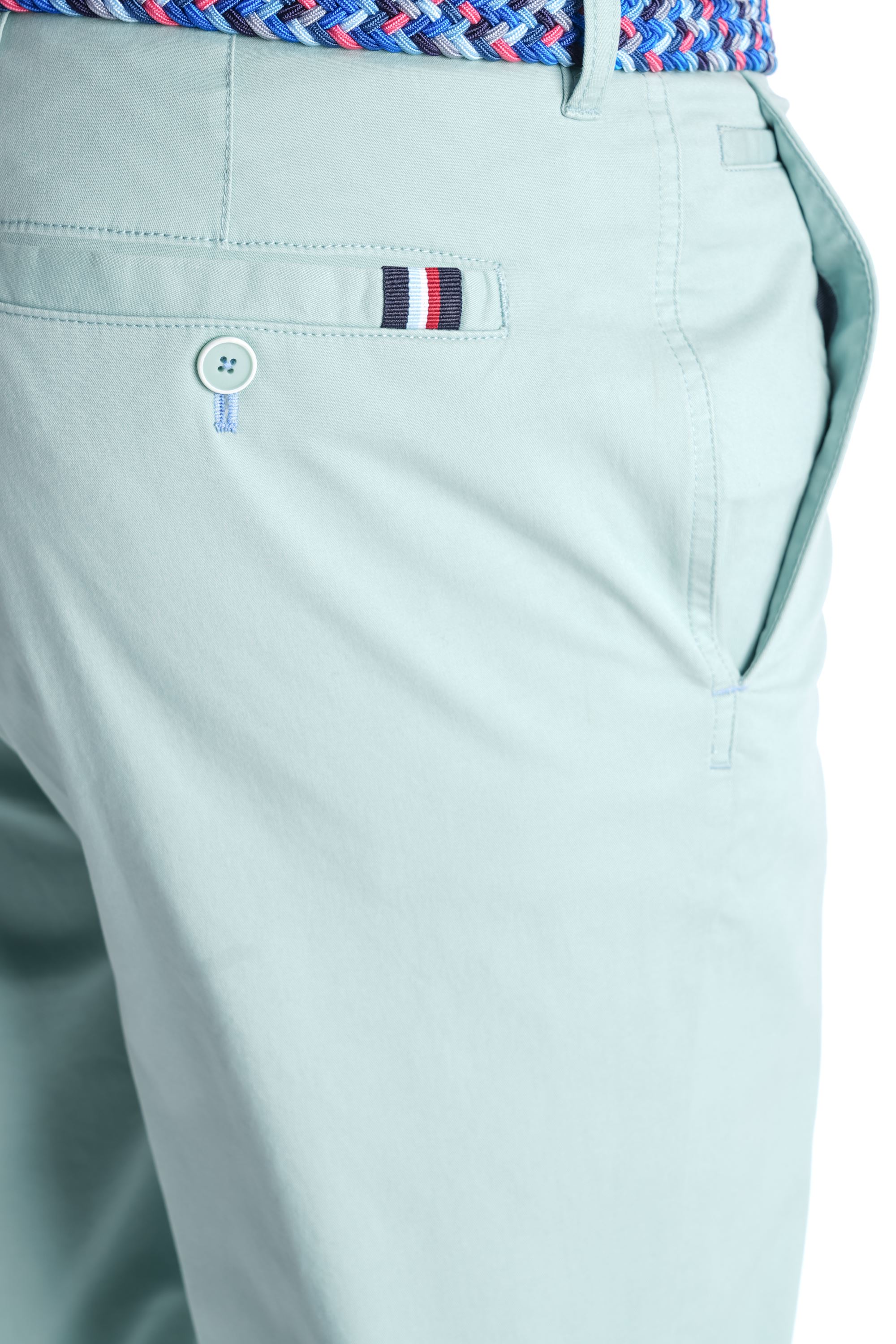 The soft mint shade pairs easily with crisp white shirts, navy jackets or bold seasonal prints. Signature detailing at the back pocket adds interest while keeping the overall look refined and easy to wear.