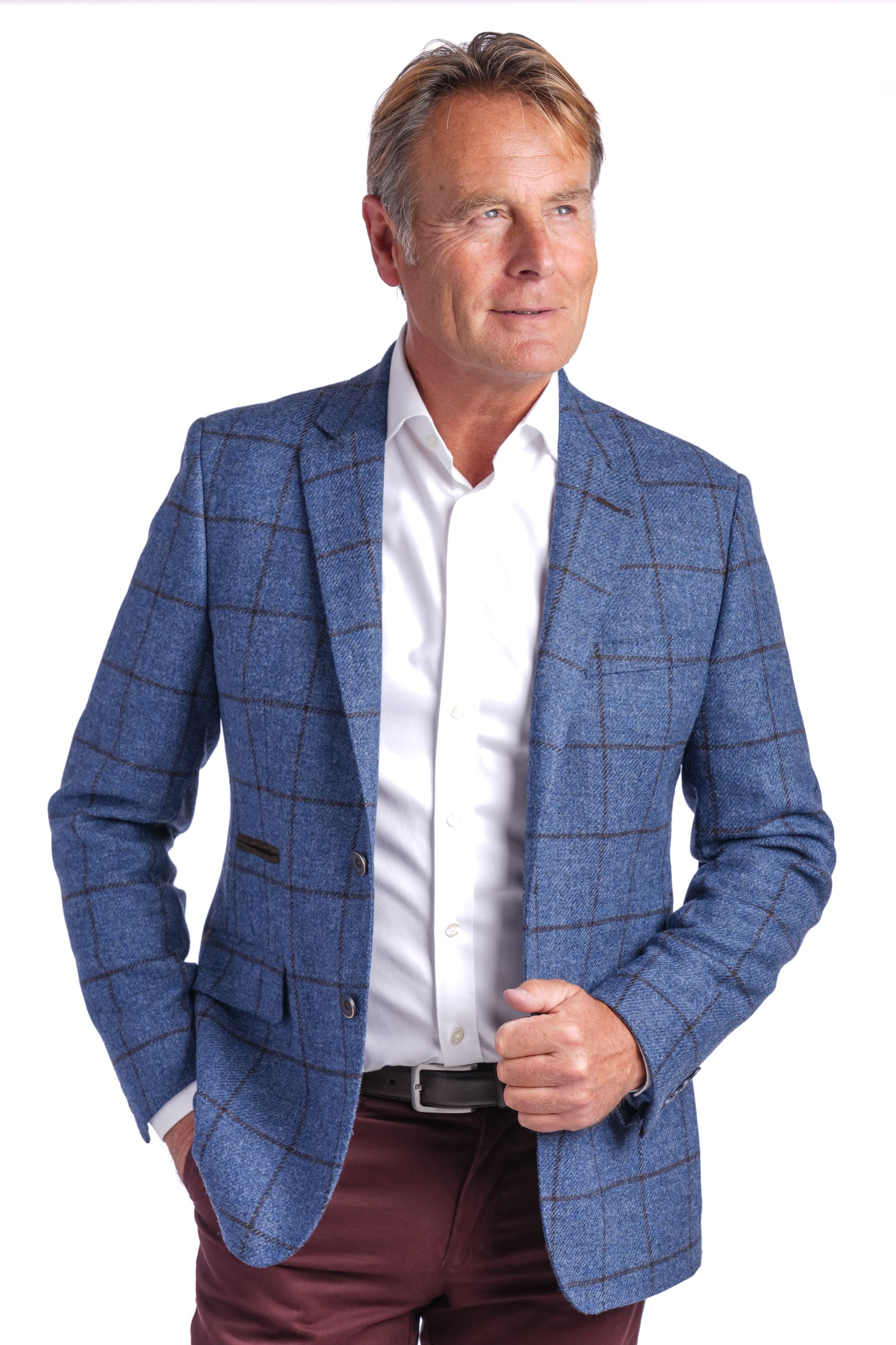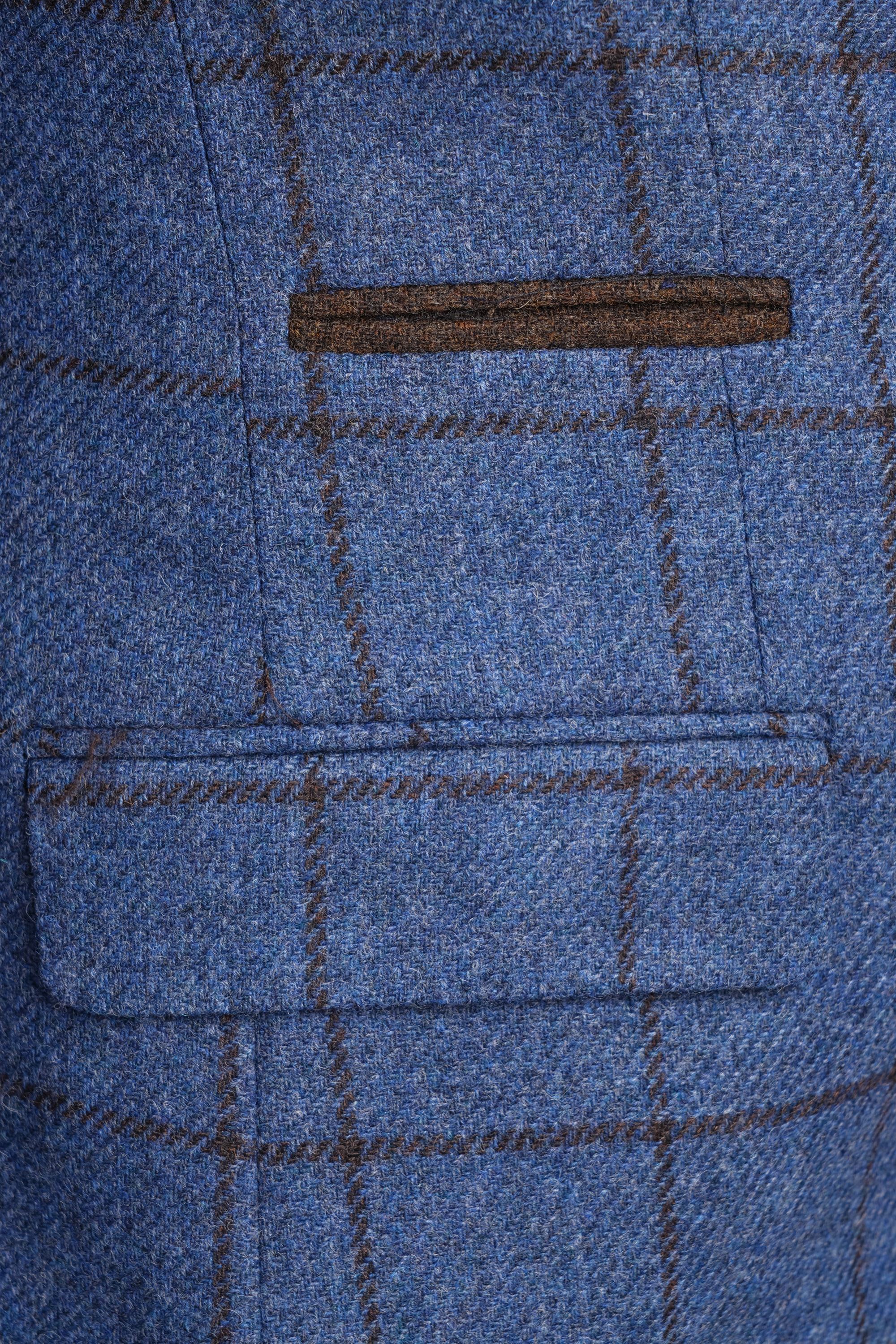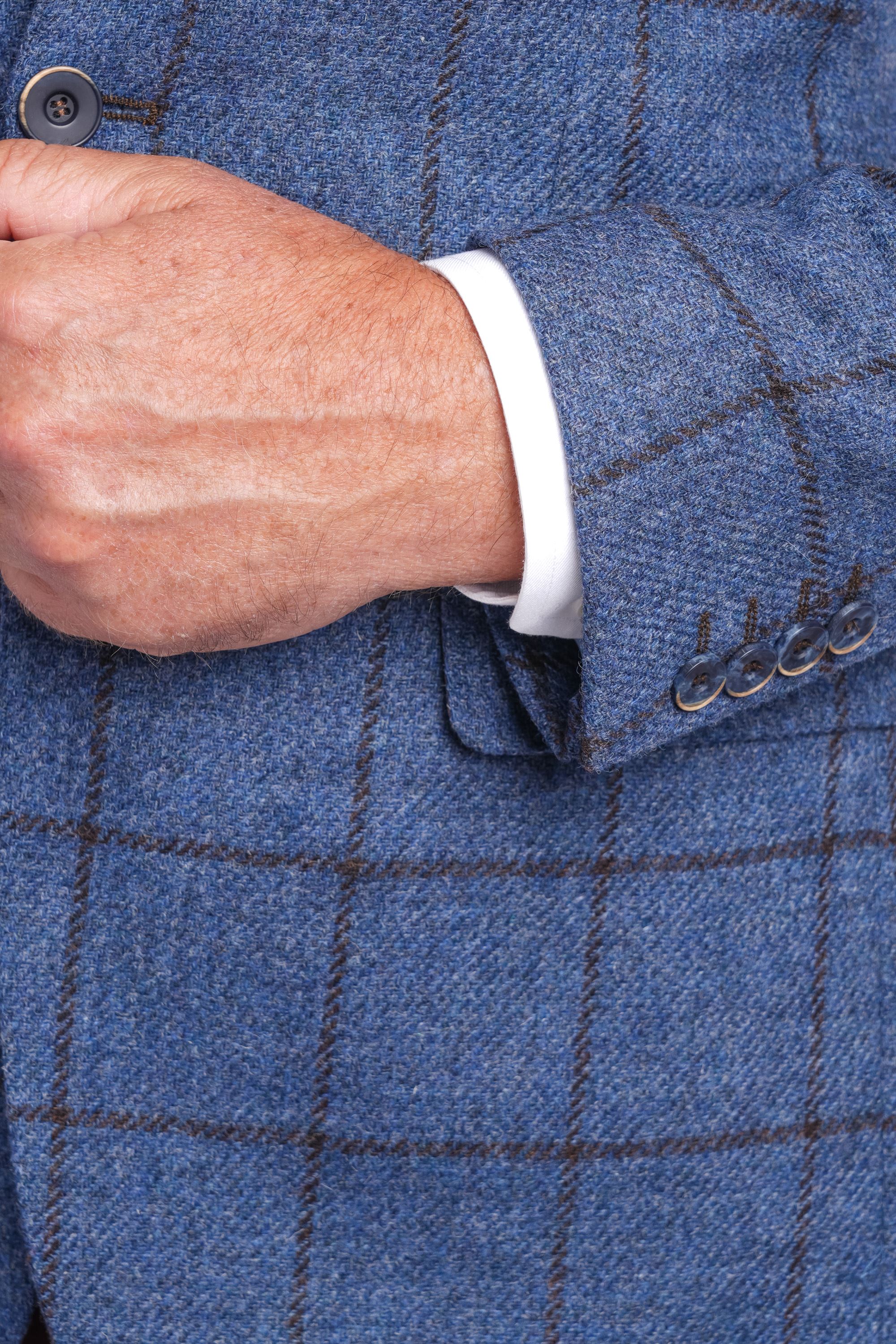 The blue shade is enhanced with subtle check detailing, providing depth and character. It pairs well with chino trousers for relaxed smart-casual outfits, or with formal trousers for a polished professional look. Checked shirts and knitwear also coordinate neatly with this jacket, giving you flexibility.